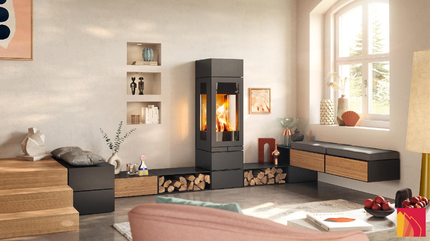 Atemberaubend, modular nach Belieben, der maßgeschneiderte Holzofen, erfunden von der deutschen Firma Skantherm. Das Modell Elements 400 3S ist zweifellos der gewagteste Kaminofen in seiner Kategorie. Mit seinen verschiedenen Modulen und Optionen bietet es die Möglichkeit, den Raum in überraschenden Kompositionen zu gestalten. Mit drei weitgehend verglasten Seiten ist das Feuer aus mehreren Blickwinkeln sichtbar. Die absolute Nüchternheit des Designs in schwarzem oder platinfarbenem Stahl bringt die Flamme zur Geltung.