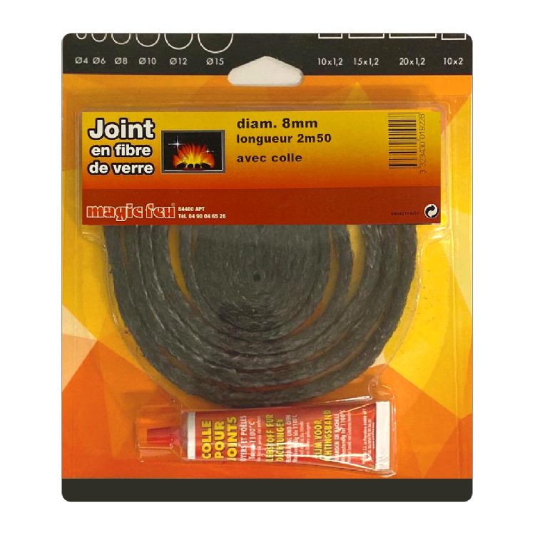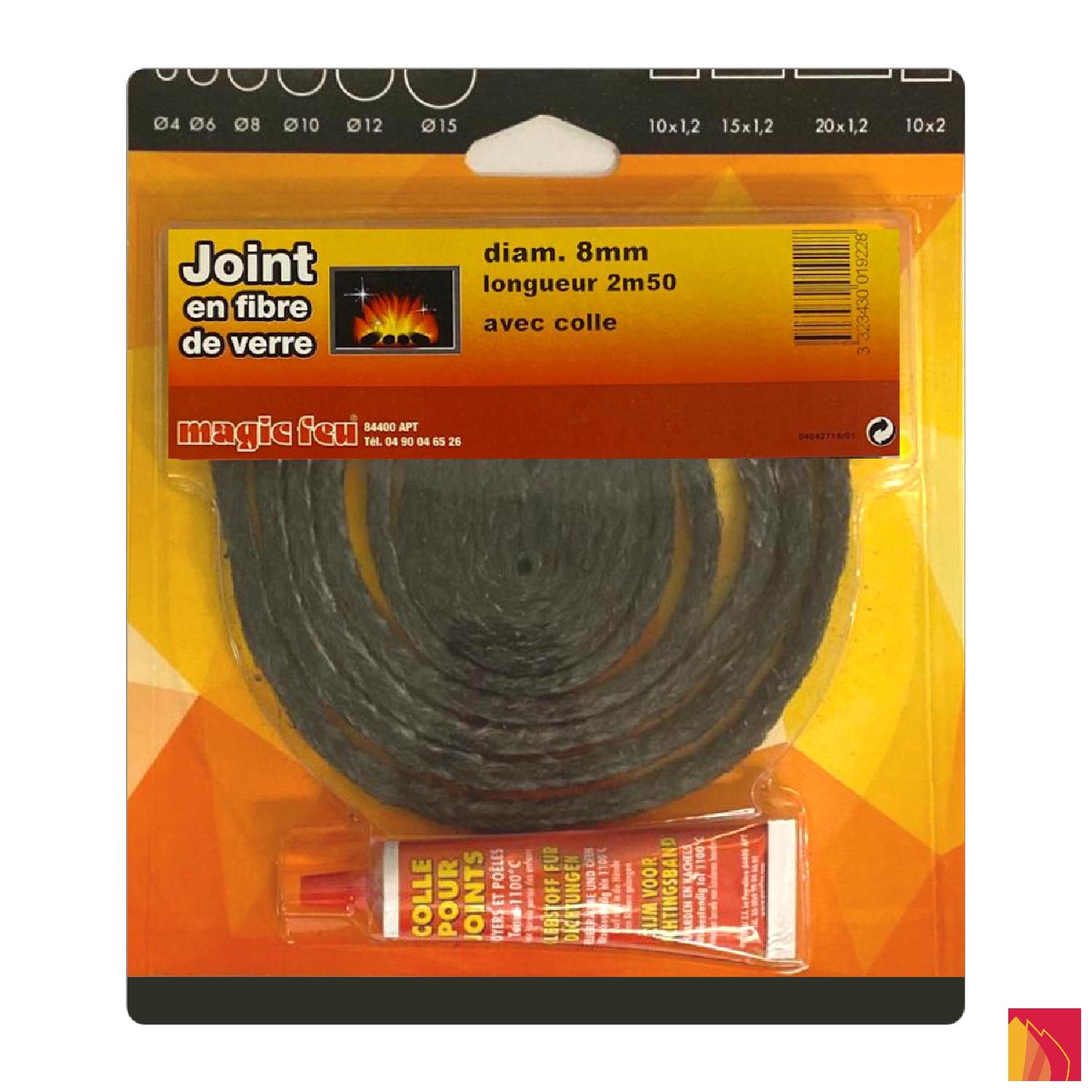 Braided fibreglass round gasket, diameter 8mm, length 250cm, with tube of high temperature glue included.