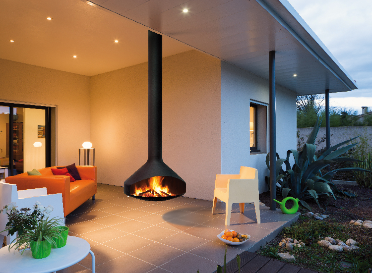 CHEMINÉE POUR L'EXTÉRIEUR, AU FOYER SUSPENDU ET PIVOTANT