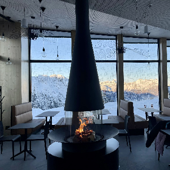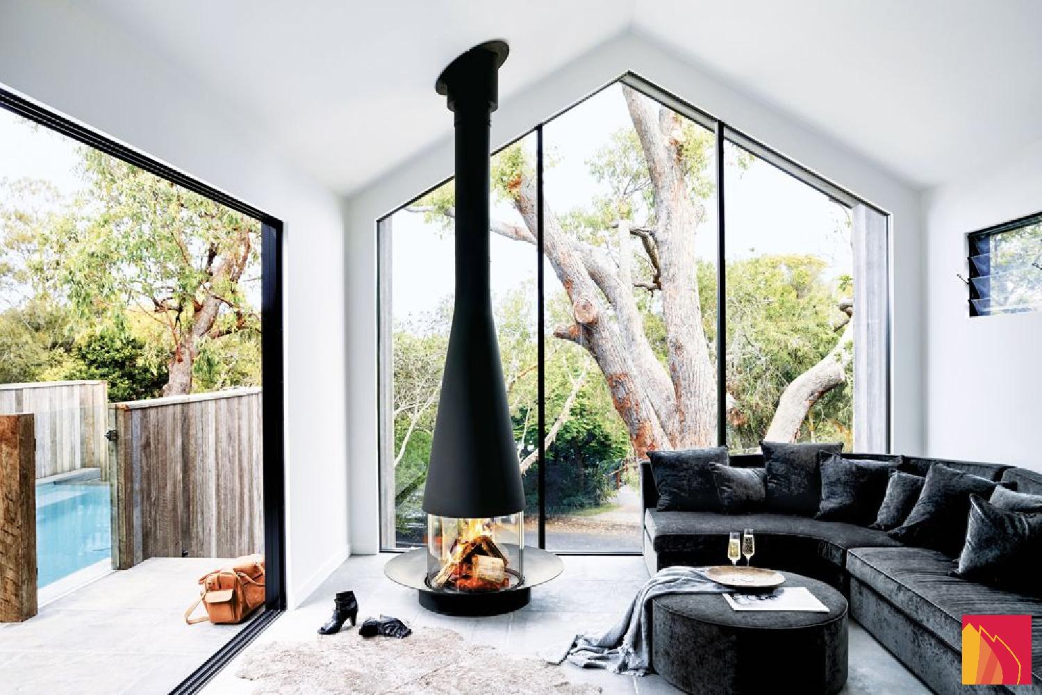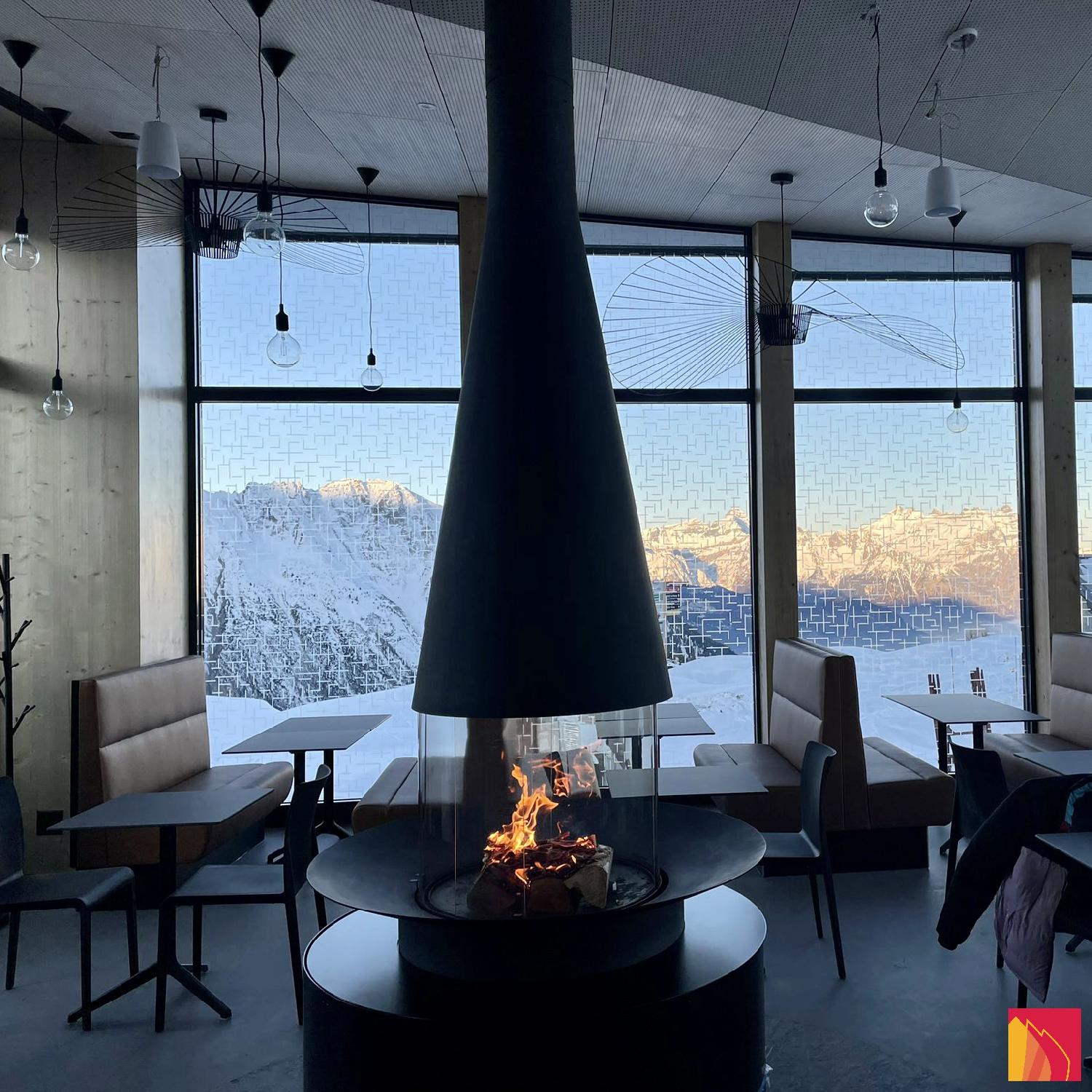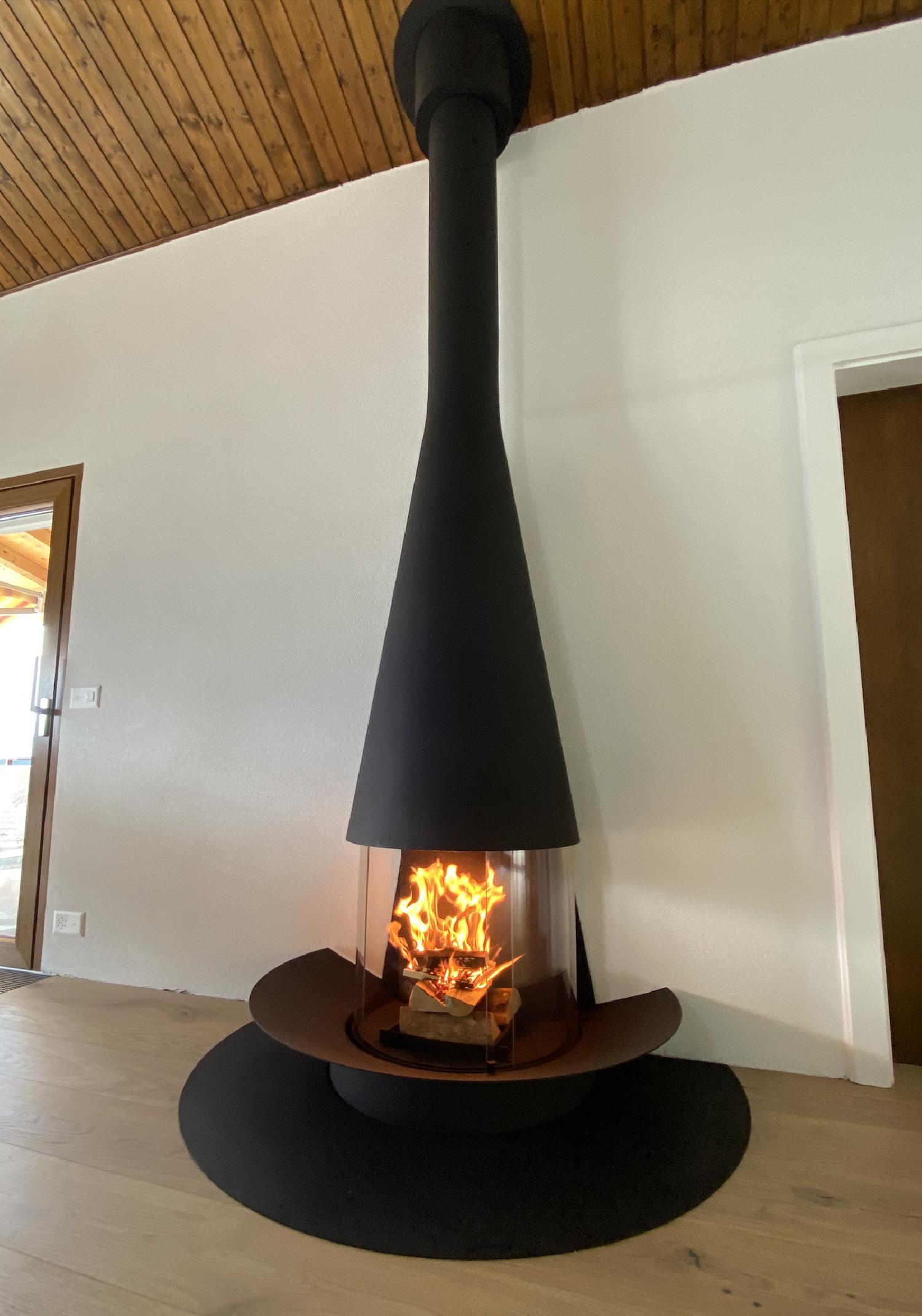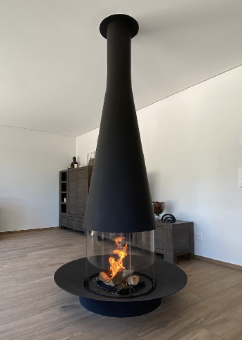 Composée d'une hotte conique à diamètre et à hauteur variables dans sa version flexible, d'un pare étincelles composé de quatre vitres courbes en pyrocéramique ( deux impostes fixes et deux vitres coulissantes) et d'une vasque foyère, la cheminée centrale à foyer vitré Filiofocus a été couronnée de nombreuses distinctions pour son design original.