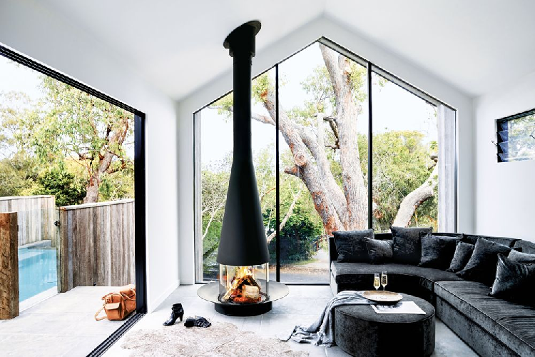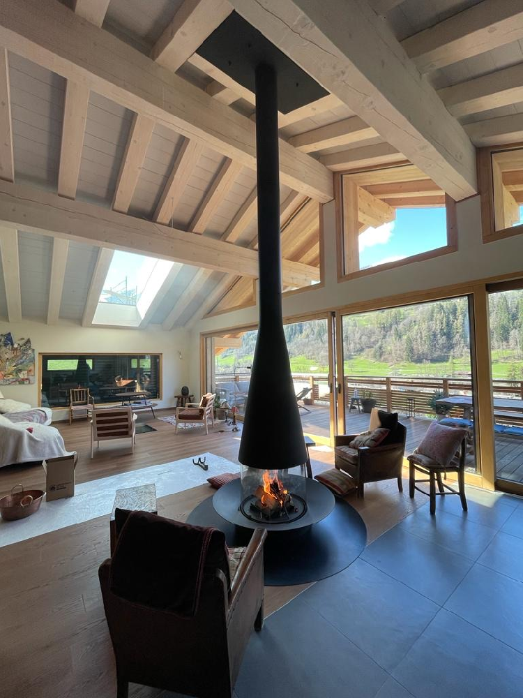 Autre particularité de ce foyer central sous hotte conique, sa vasque foyère peut être déposée à même le sol, incluse directement dans le sol ou surélevée grâce notamment, à un socle métallique assorti. Véritable point de ralliement de toute la tribu familiale ou de copains, elle est d'une convivialité sans pareil.