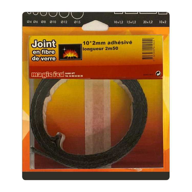 Joint rond en fibre de verre tressée et de forme plate, longueur 250cm. Ce joint est autocollant.