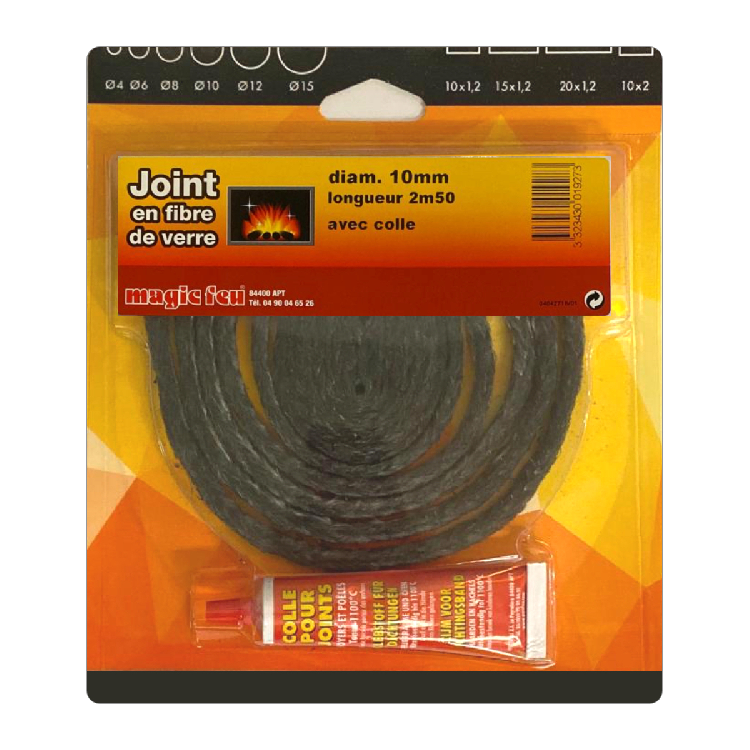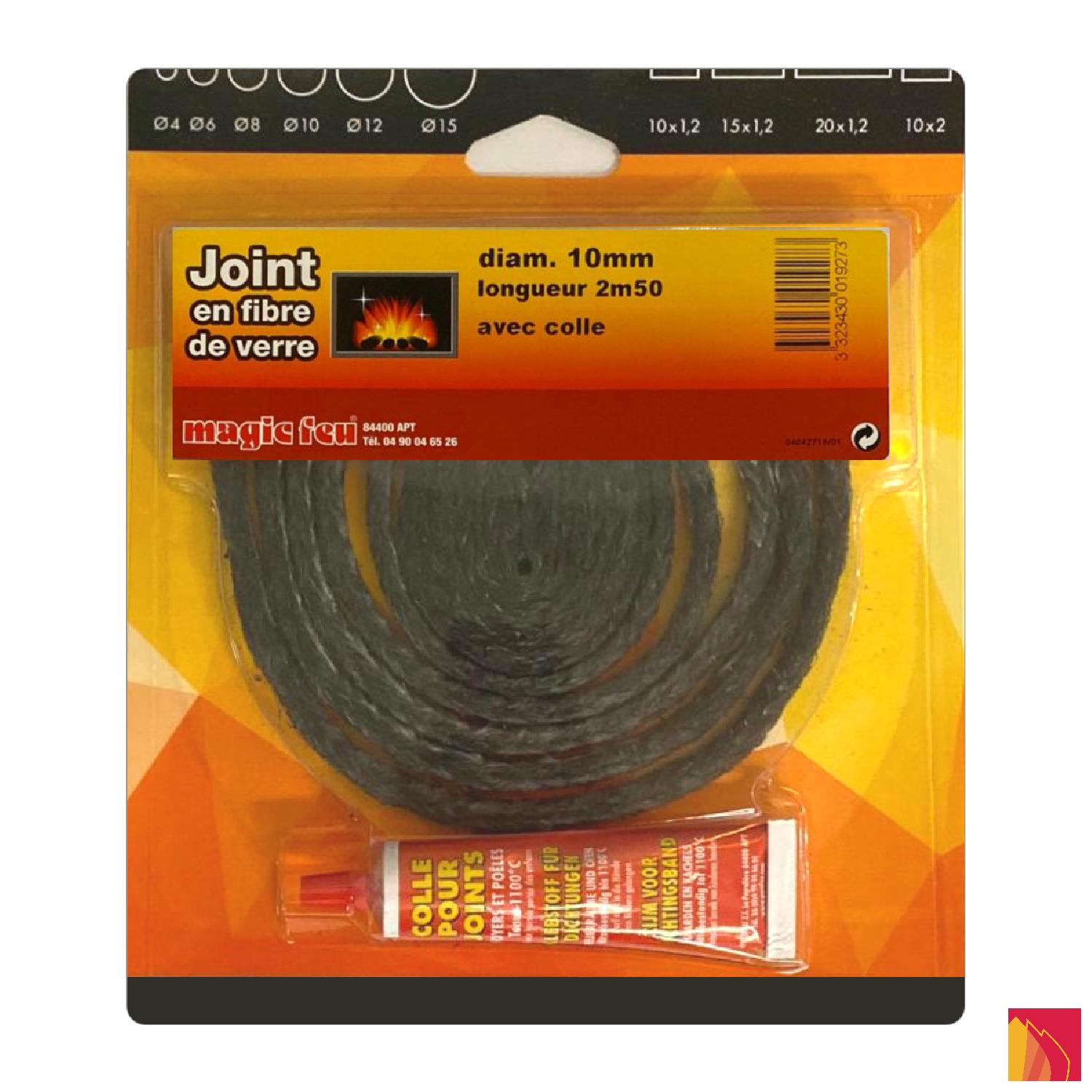 Joint rond en fibre de verre tressée, diamètre 10mm, longueur 250cm, avec tube de colle haute température inclus.