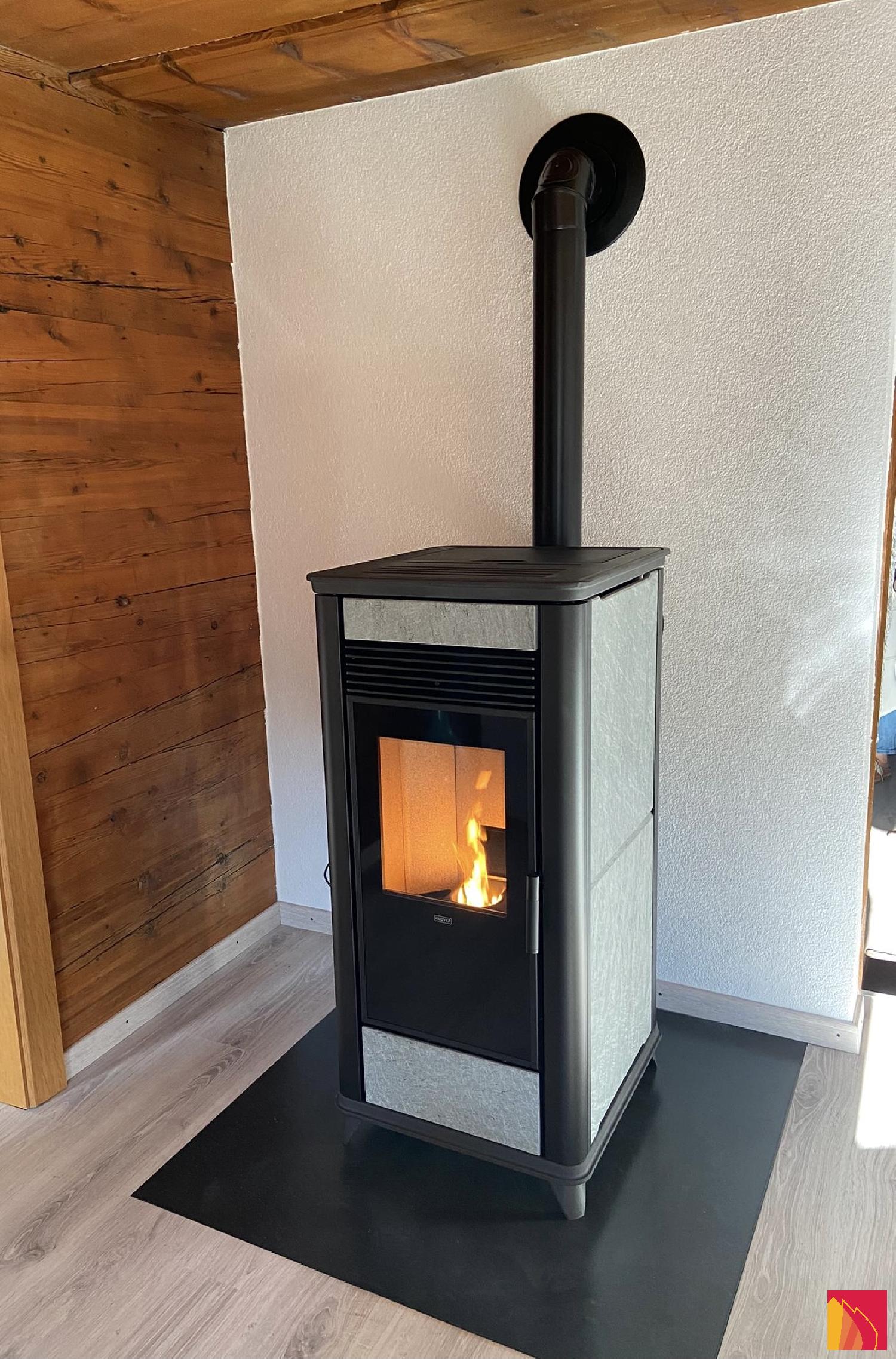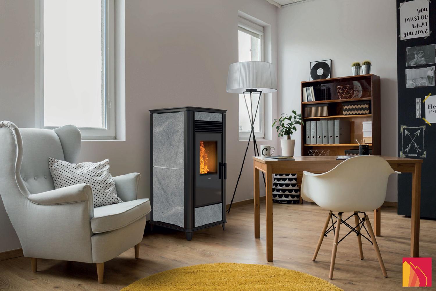 Avec ses allures retro, le poêle à pellets Class Air 90 est un véritable meuble à lui tout seul. Même s'il n'est pas massif au sens littéral du terme, ce fourneau prendra la place d'un bibus. Entièrement vêtu de céramique (bordeaux, noir, ivoire ou pierre ollaire), il laisse une très large place à la flamme au travers d'une vitre centrale bien placée.
