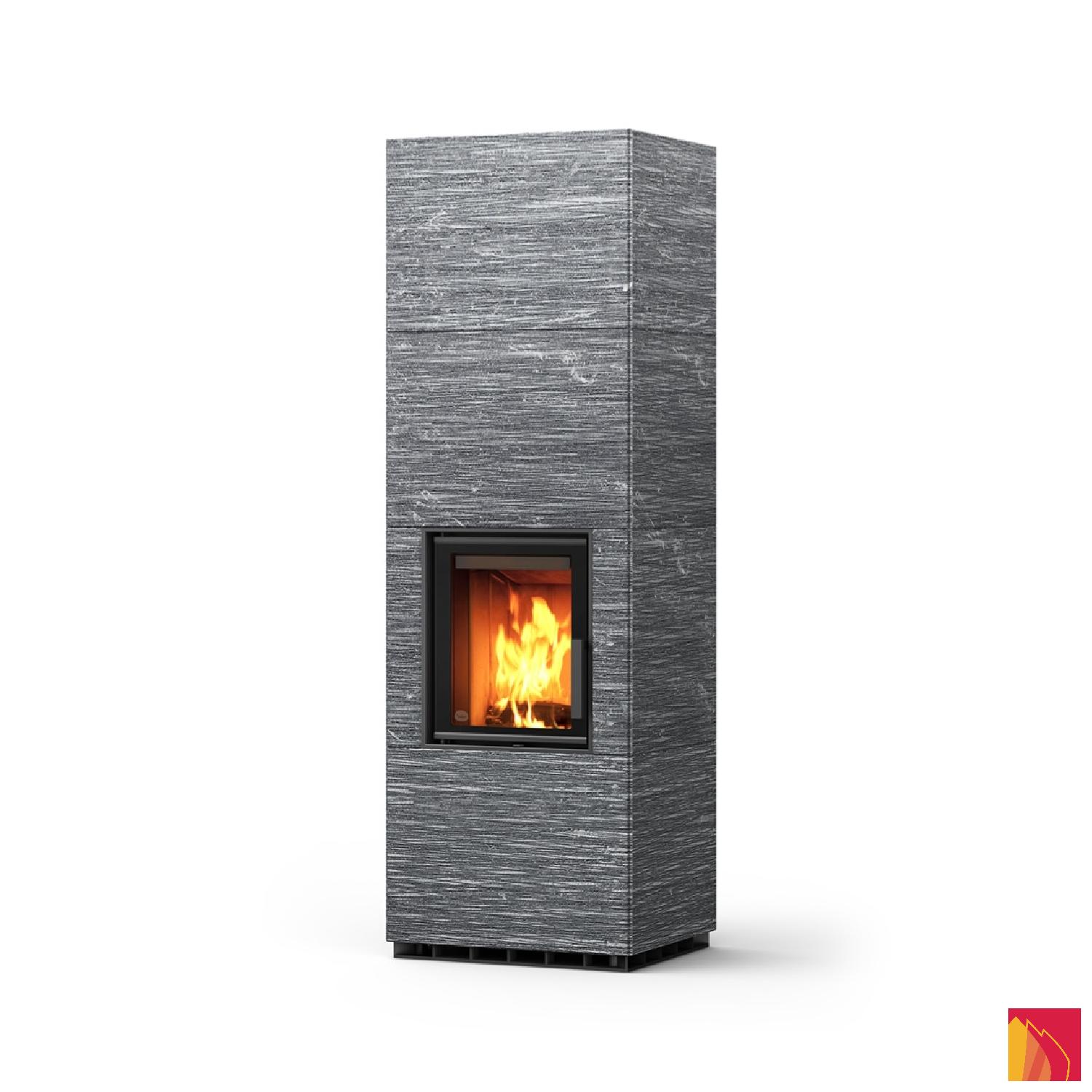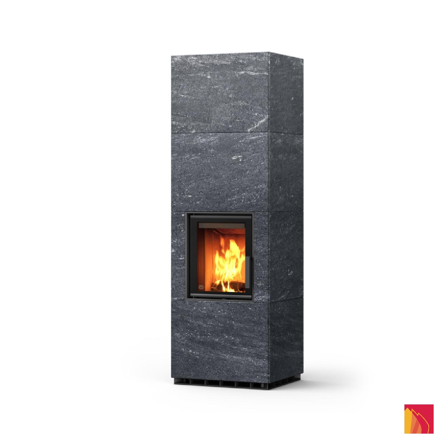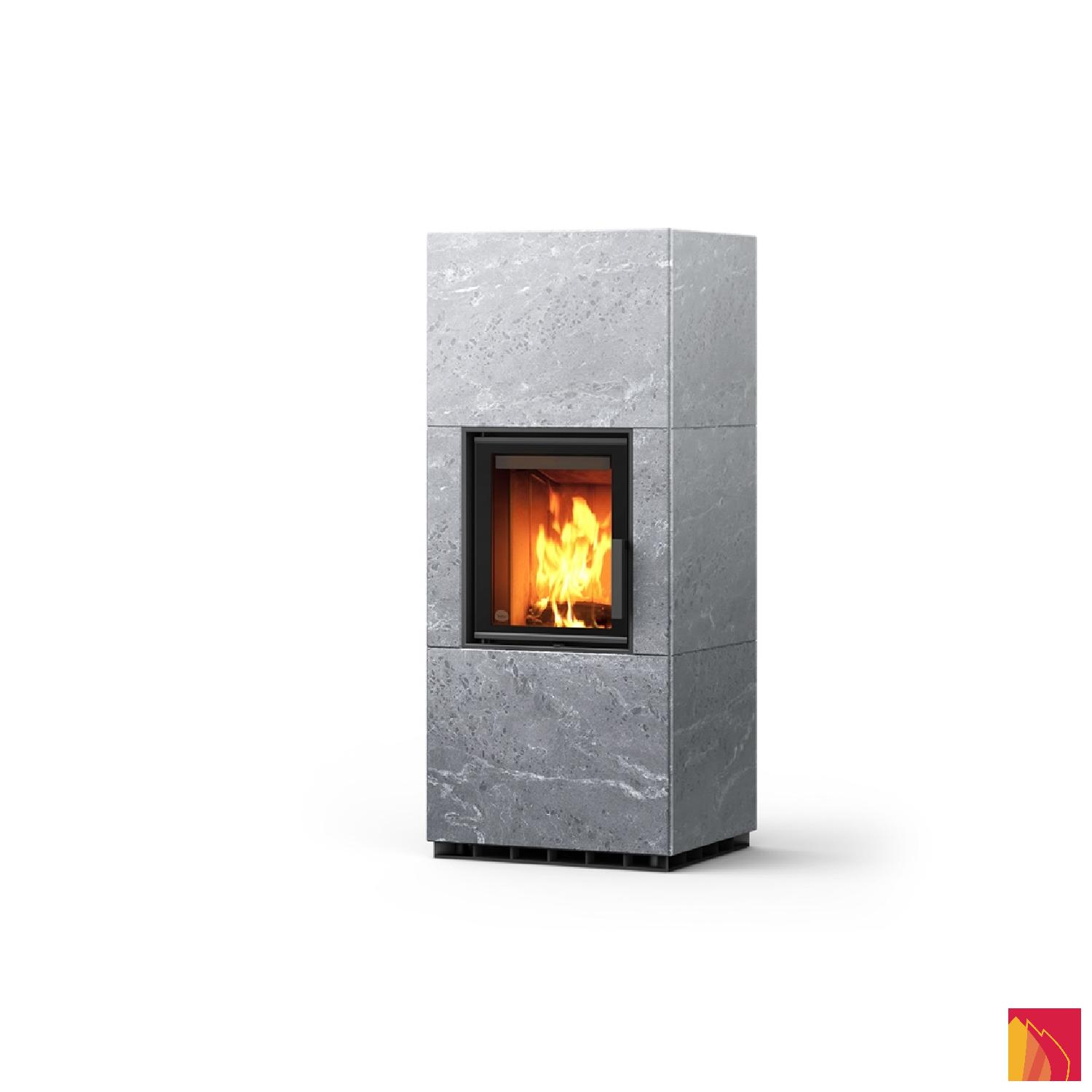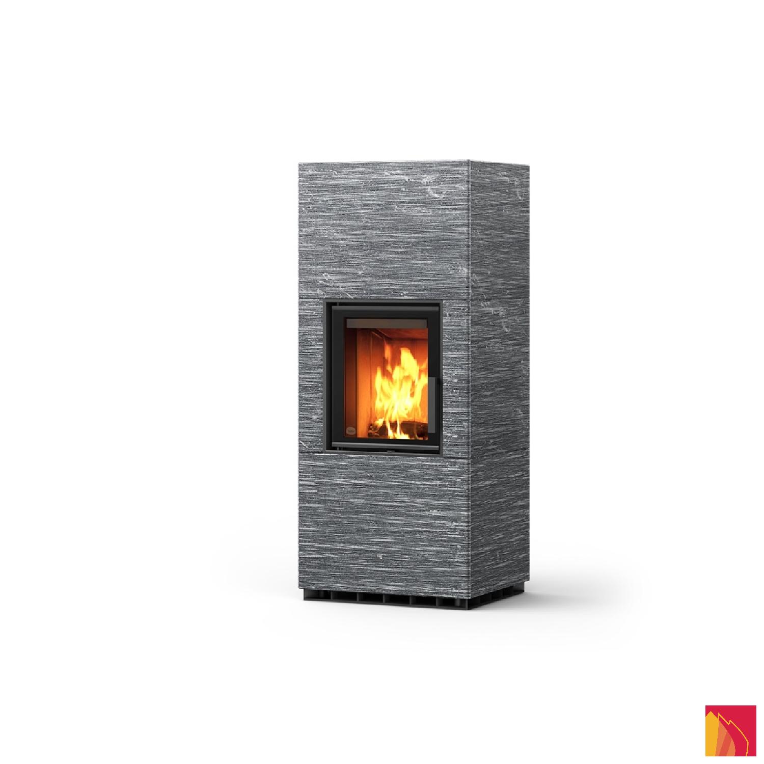 Vous avez le choix entre trois surfaces en stéatite : polie avec sensation veloutée, rugueuse ou évoquant le daim. Sa porte verticale haute offre une vue dégagée sur les flammes virevoltantes.