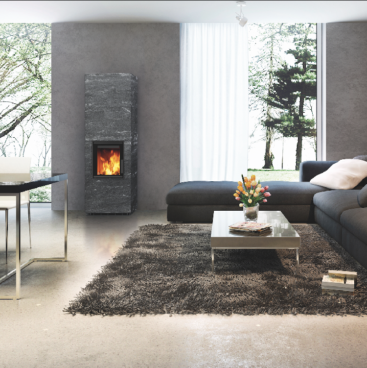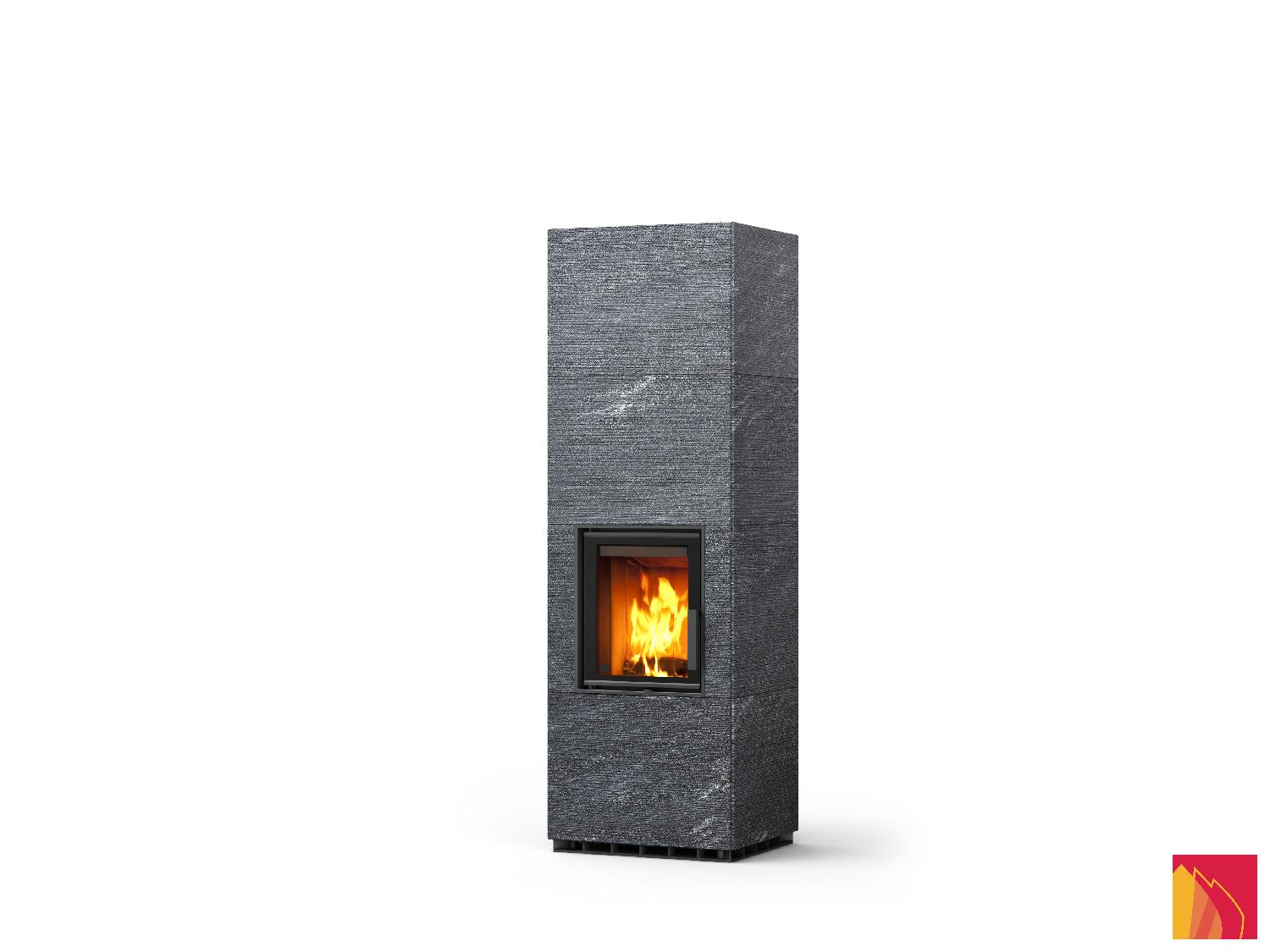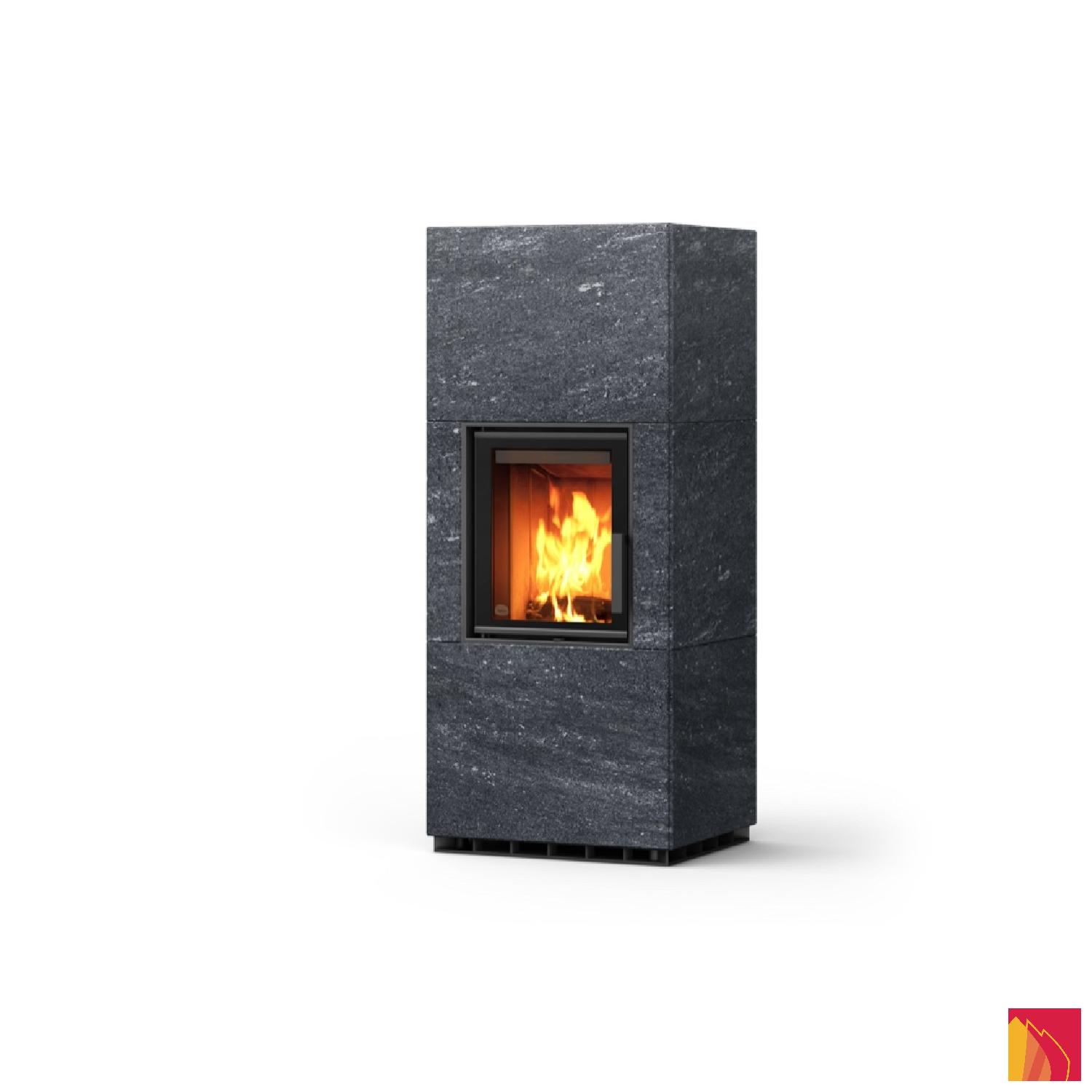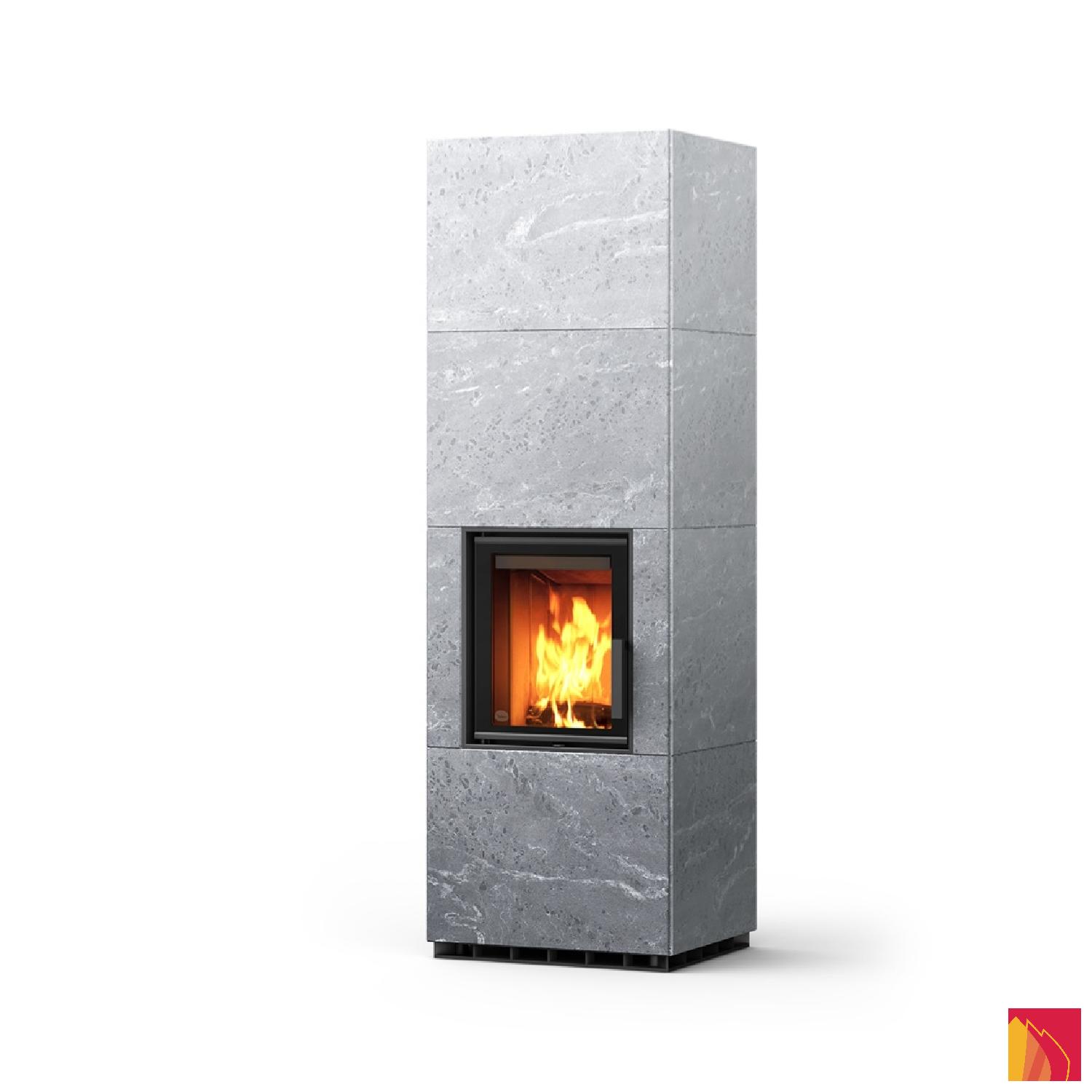 Vous avez le choix entre trois surfaces en stéatite : polie avec sensation veloutée, rugueuse ou évoquant le daim. Sa porte verticale haute offre une vue dégagée sur les flammes virevoltantes.