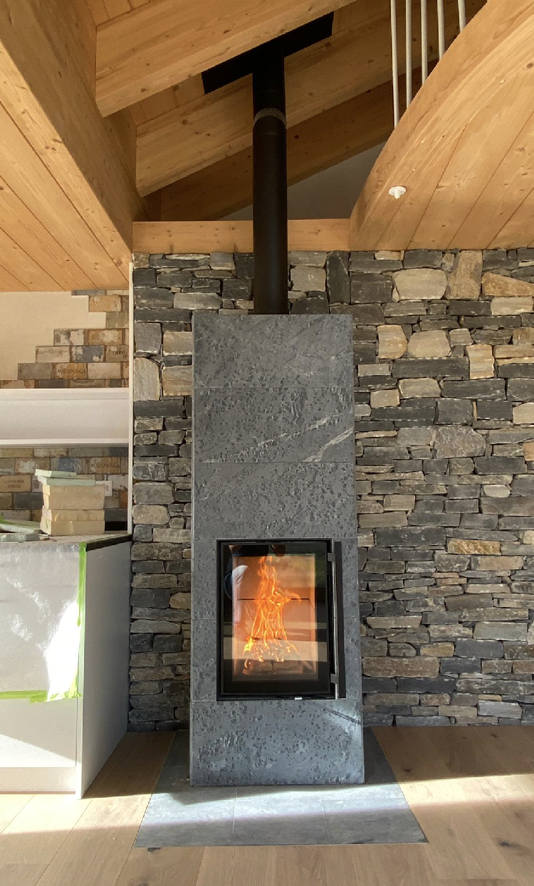 Le revêtement de surface comprend des dalles en stéatite lisses, rainurées ou Grafia avec motifs découpés au jet d’eau. La porte d’aspect moderne dispose d’un fin rebord métallique anthracite et d’un double vitrage.