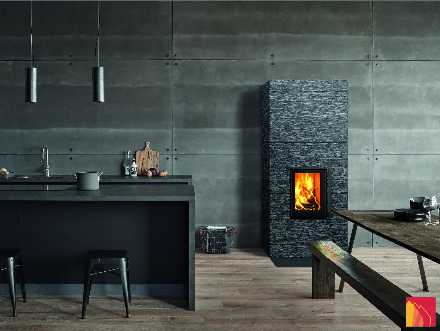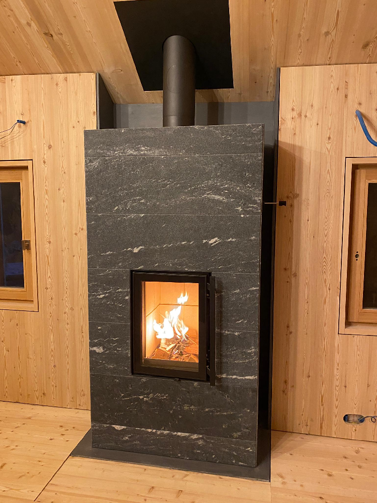 Le revêtement de surface comprend des dalles en stéatite lisses, rainurées ou Grafia avec motifs découpés au jet d’eau. La porte d’aspect moderne dispose d’un fin rebord métallique anthracite et d’un double vitrage.