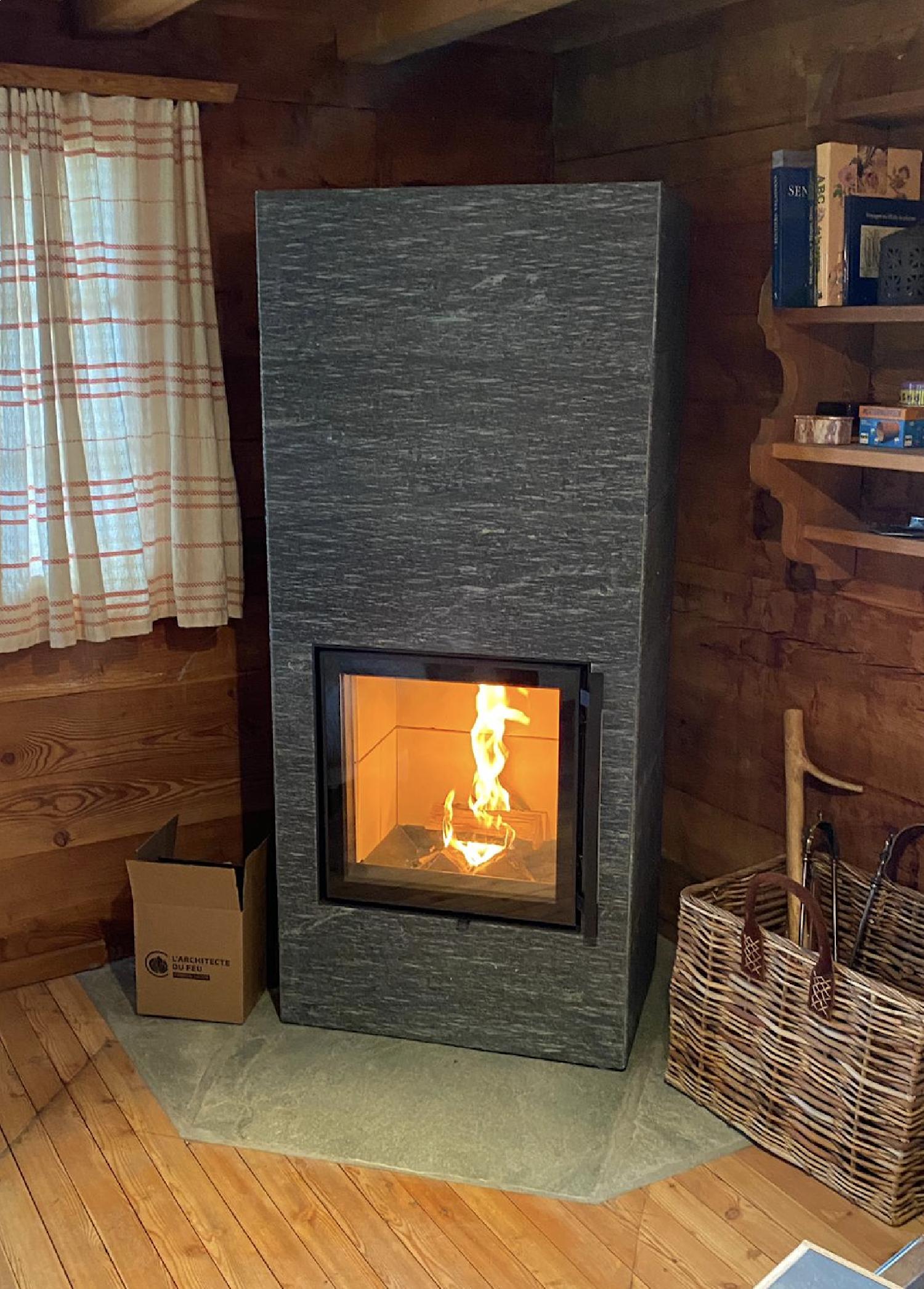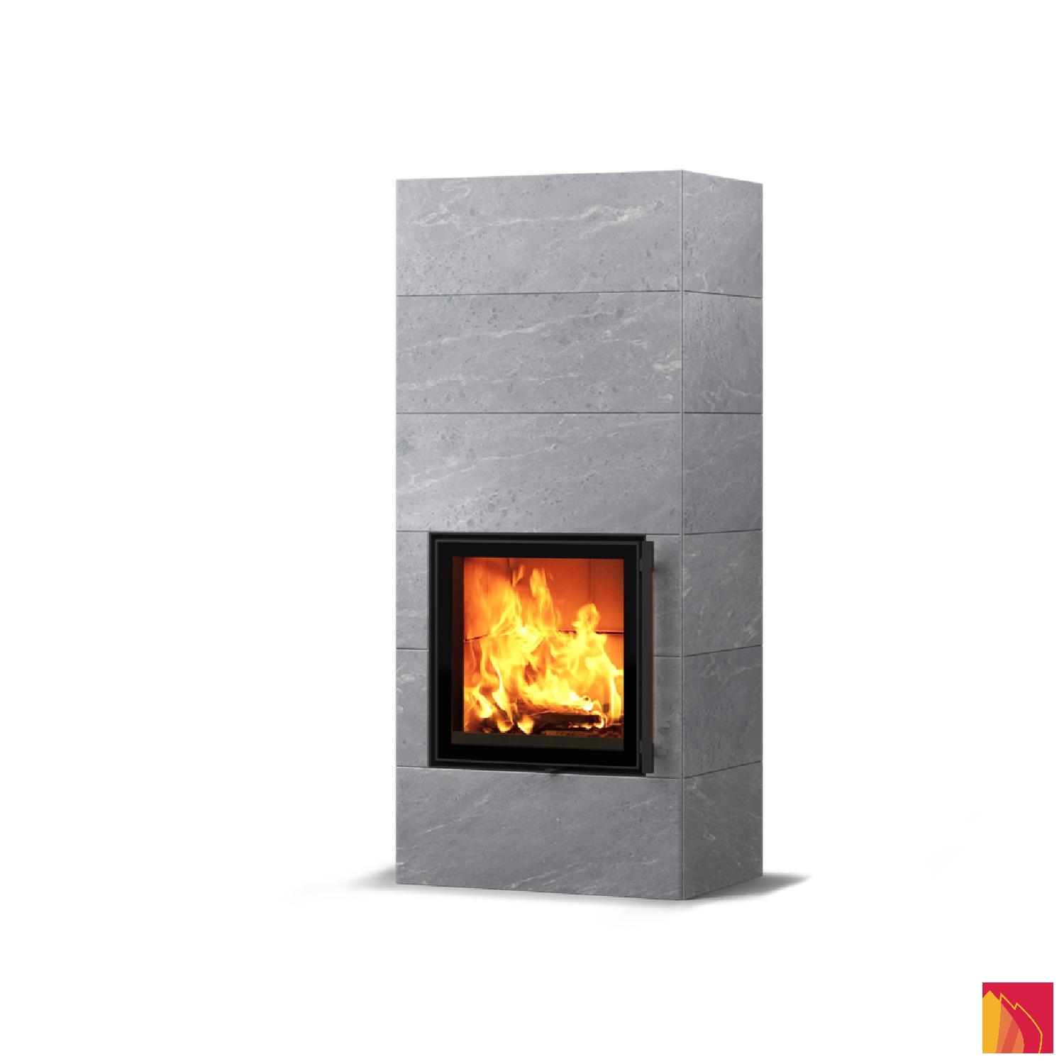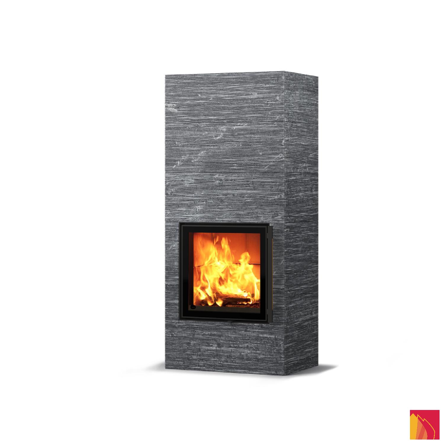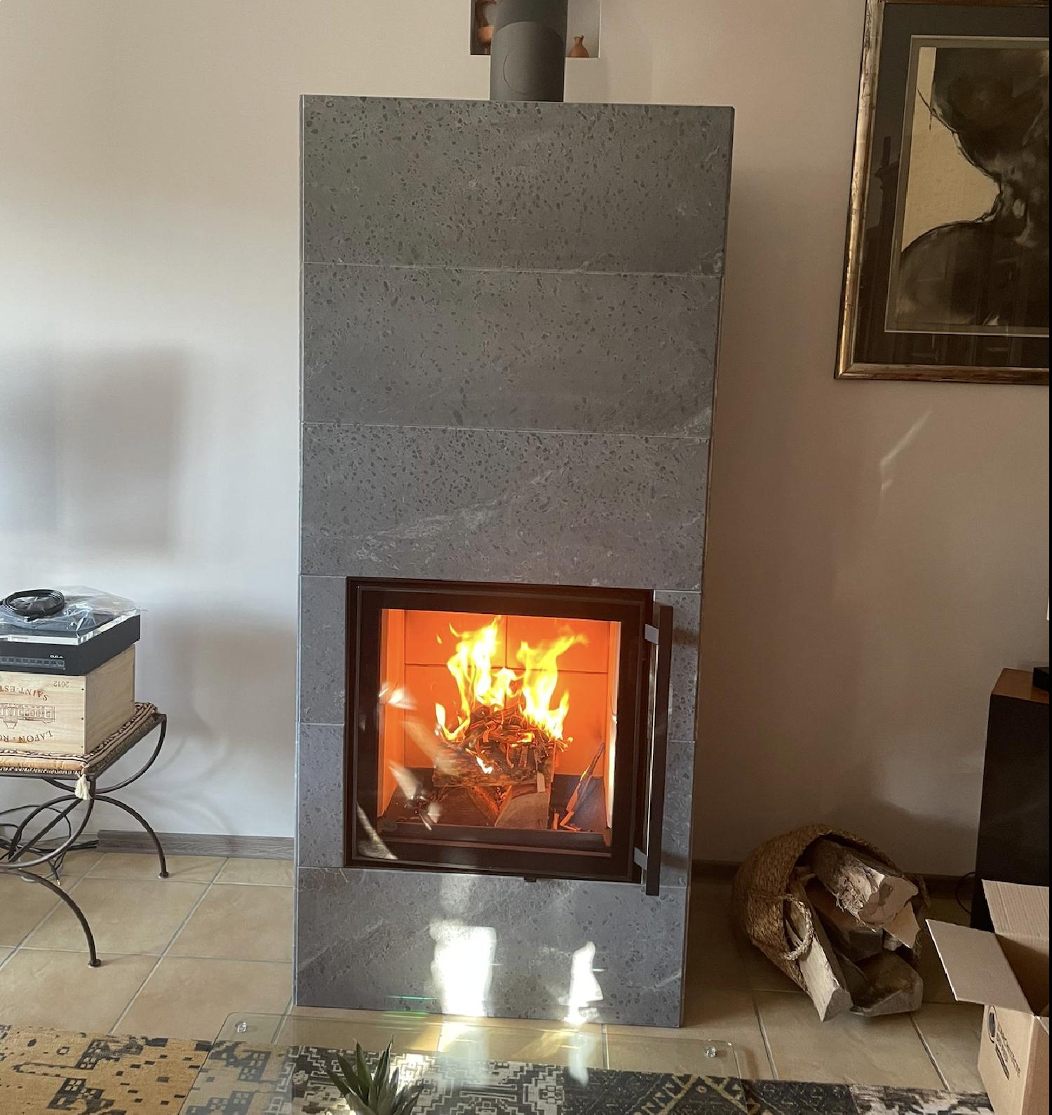 La finition de surface comprend des dalles en stéatite lisses, rainurées ou Grafia avec motifs découpés au jet d’eau. L’ample porte de forme carrée comporte un double vitrage ralentissant en douceur le transfert de la chaleur dans l’espace ambiant. La partie arrière de sa poignée est en bois.