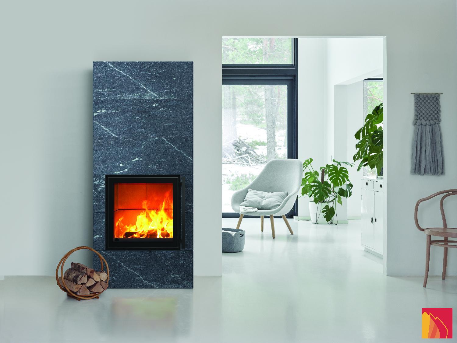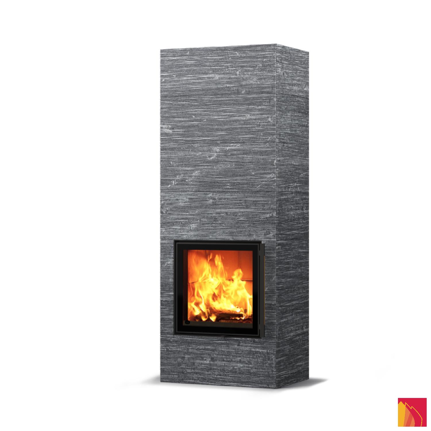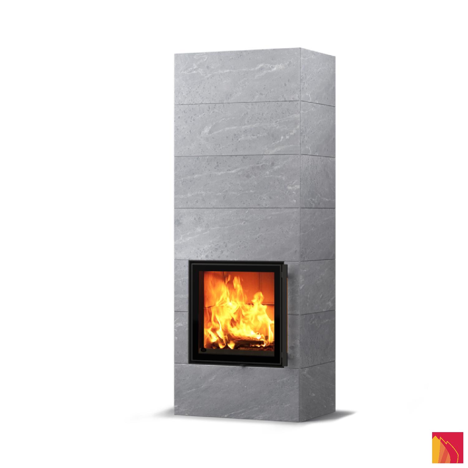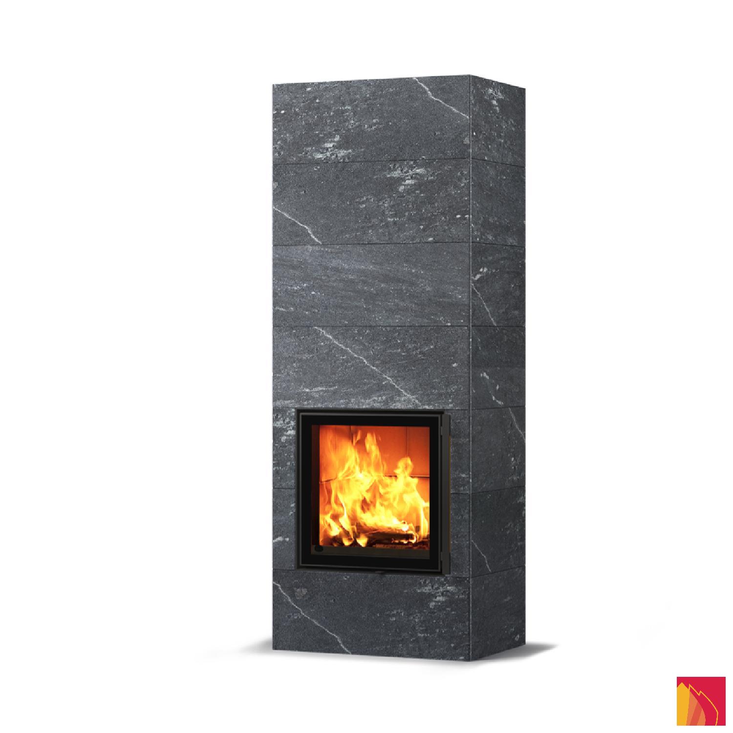 La finition de surface comprend des dalles en stéatite lisses, rainurées ou Grafia avec motifs découpés au jet d’eau. L’ample porte de forme carrée comporte un double vitrage ralentissant en douceur le transfert de la chaleur dans l’espace ambiant. La partie arrière de sa poignée est en bois.