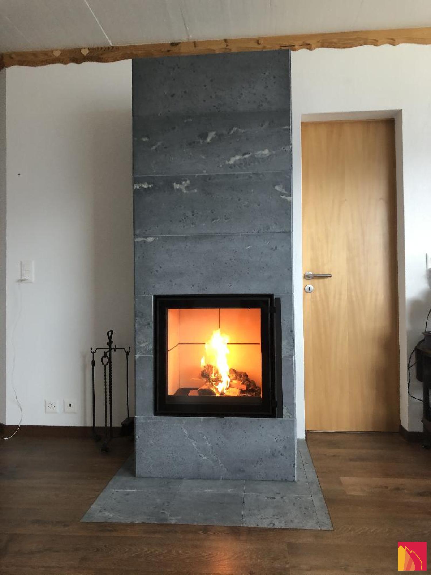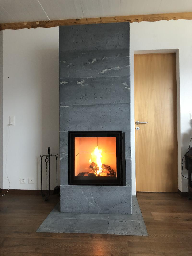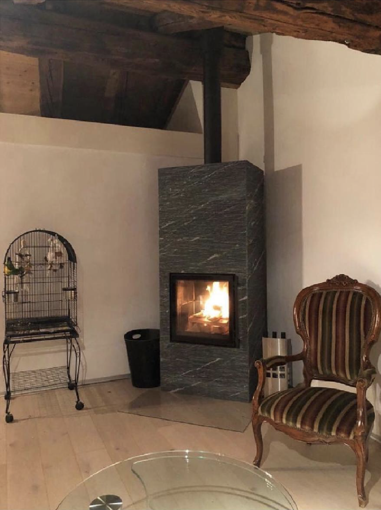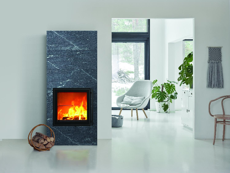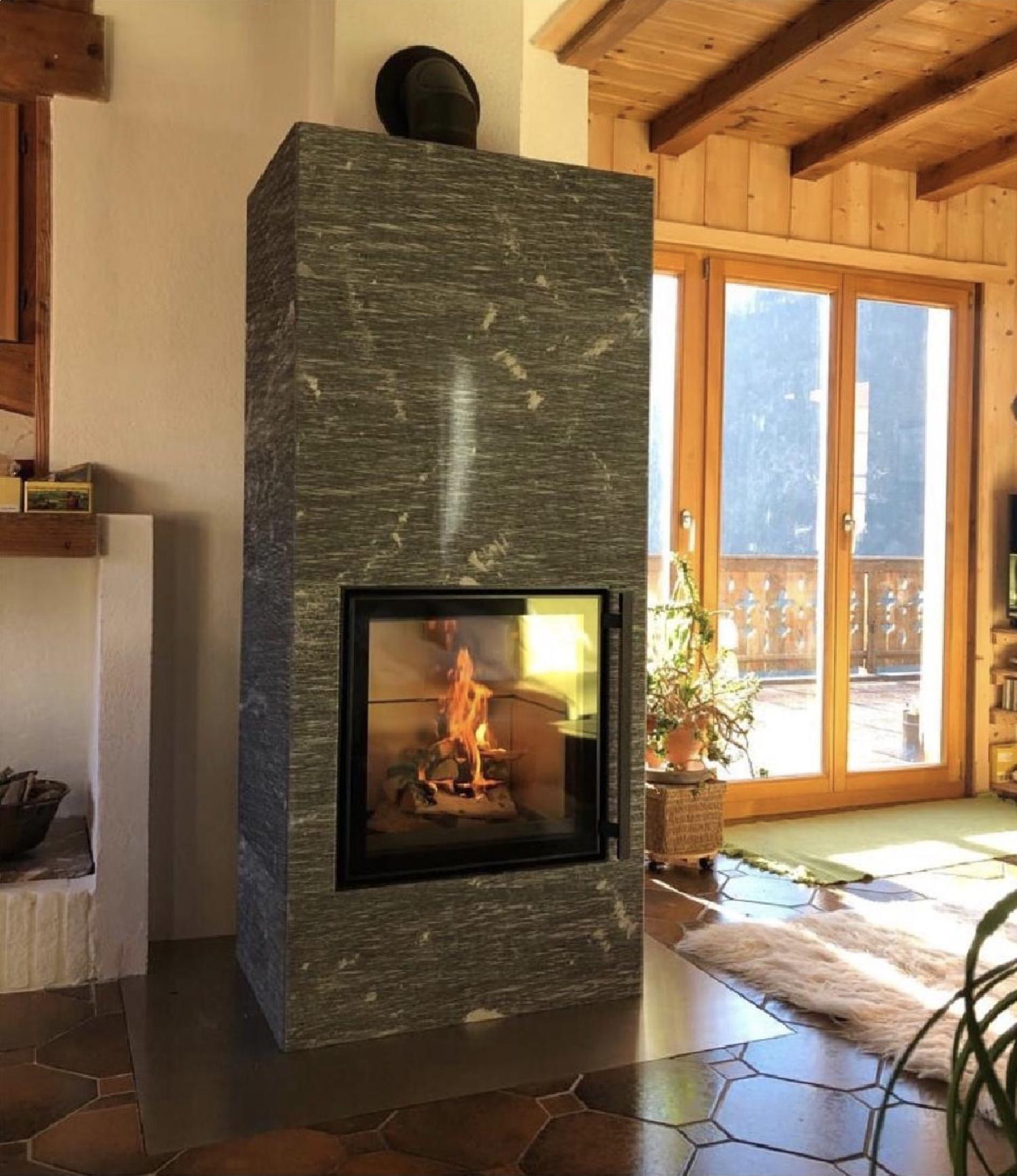 La finition de surface comprend des dalles en stéatite lisses, rainurées ou Grafia avec motifs découpés au jet d’eau. L’ample porte de forme carrée comporte un double vitrage ralentissant en douceur le transfert de la chaleur dans l’espace ambiant. La partie arrière de sa poignée est en bois.