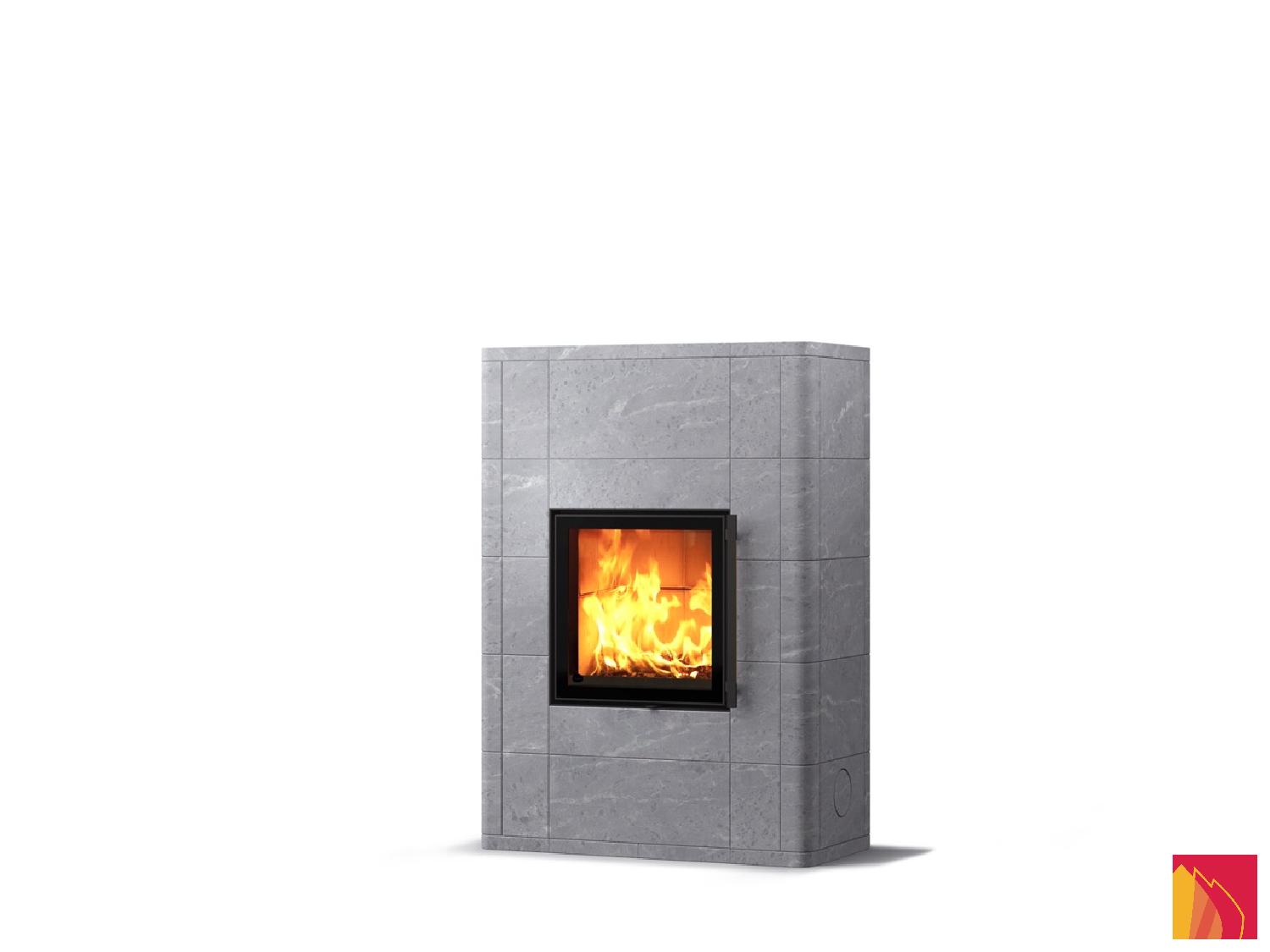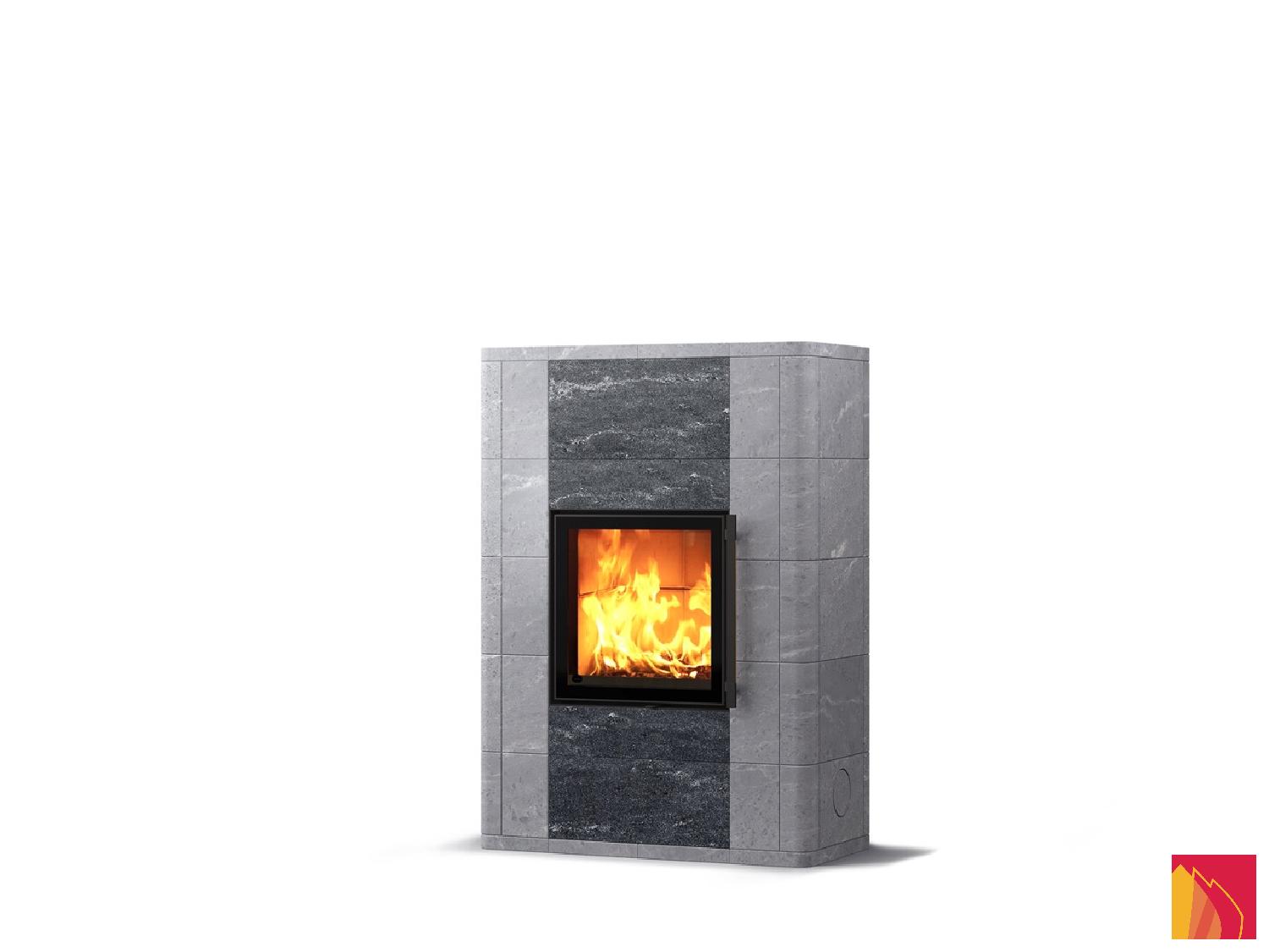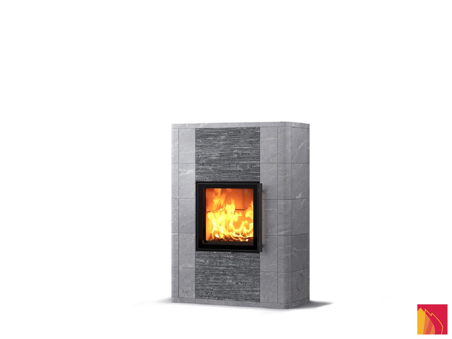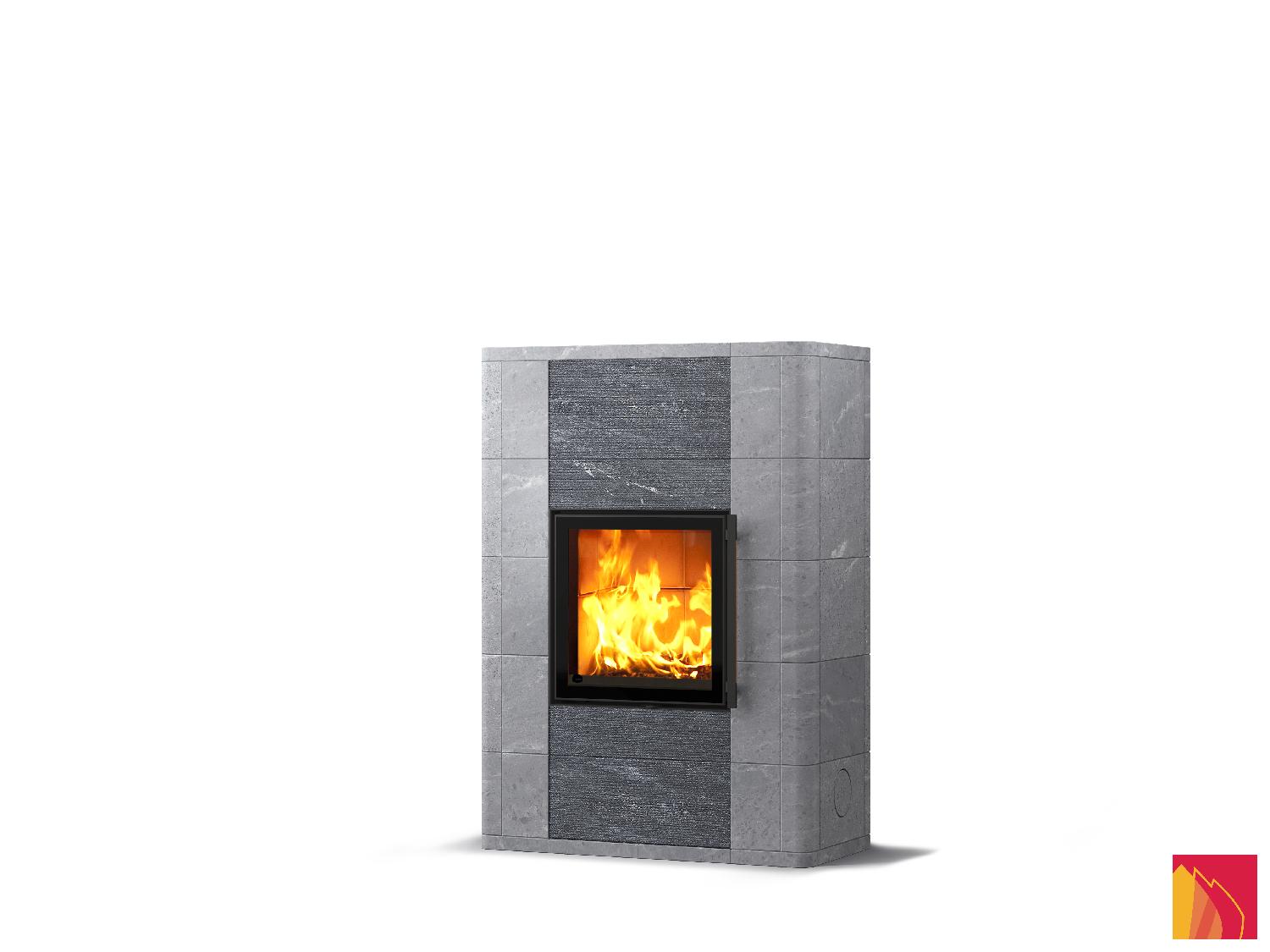 Les options de finition sont la stéatite lisse classique et la surface Grafia, sur laquelle des motifs chatoyants irréguliers ont été réalisés au jet d’eau. La porte moderne de forme carrée offre une vue superbe sur le feu.