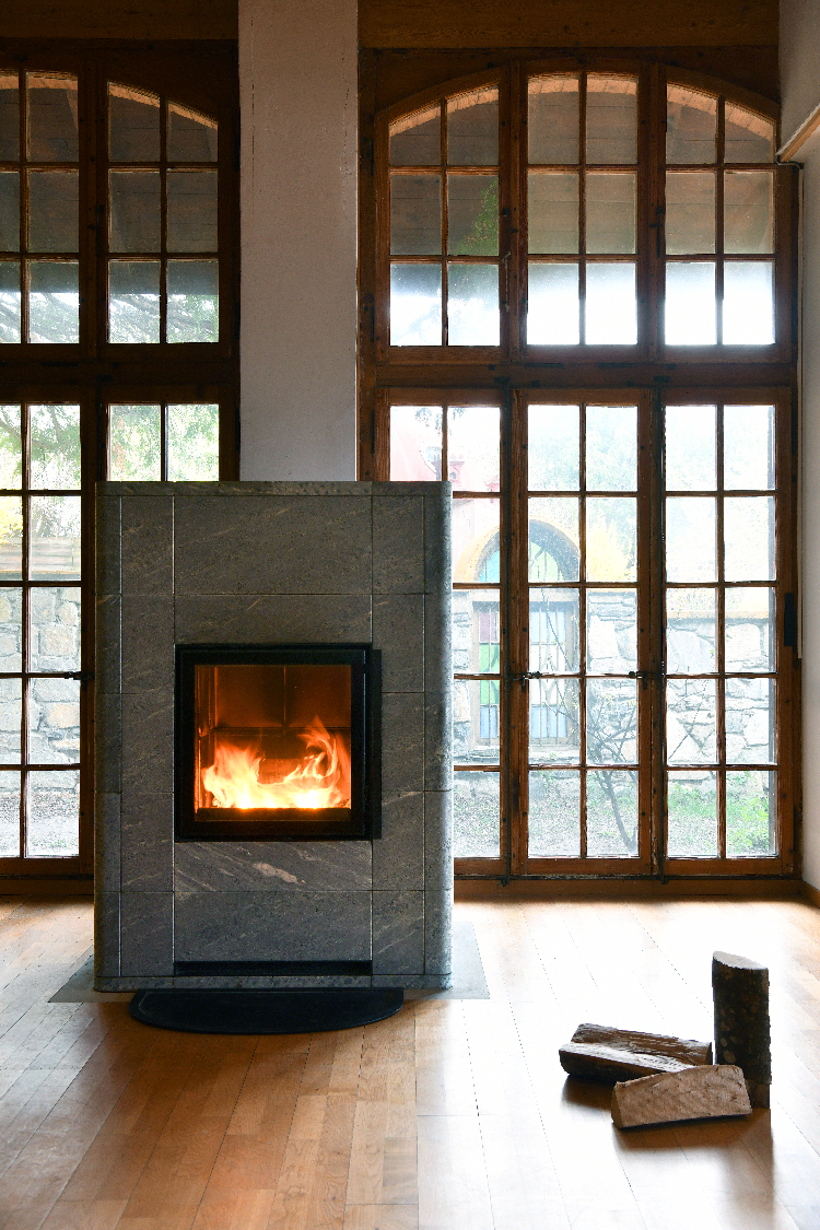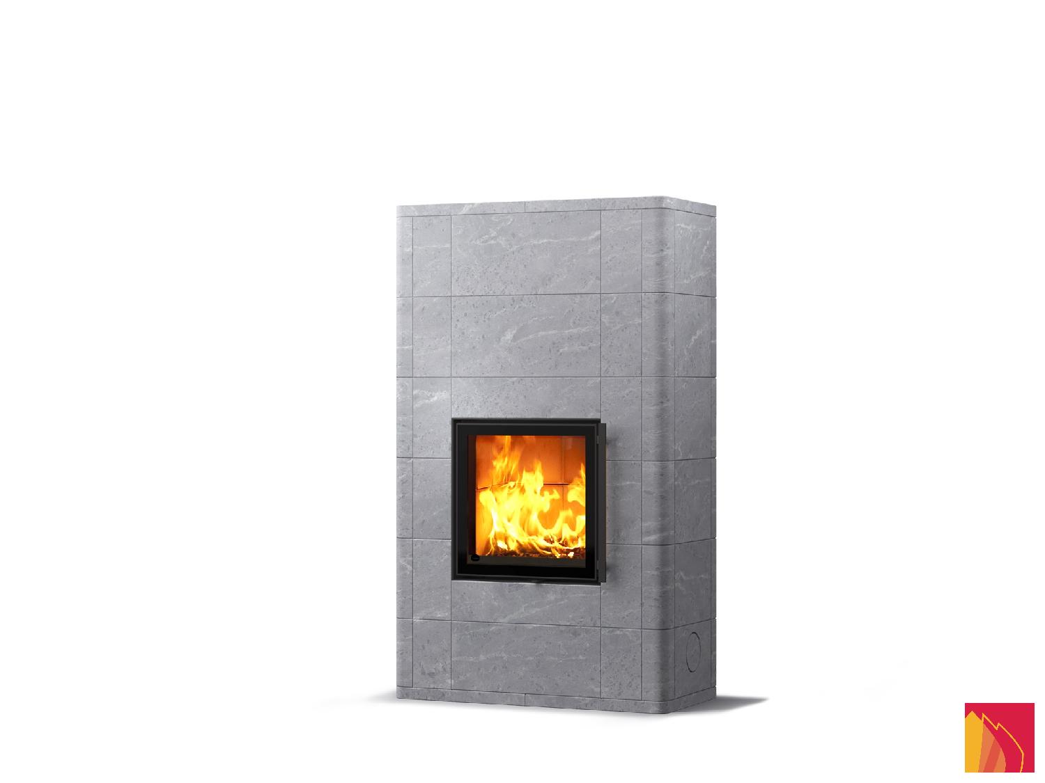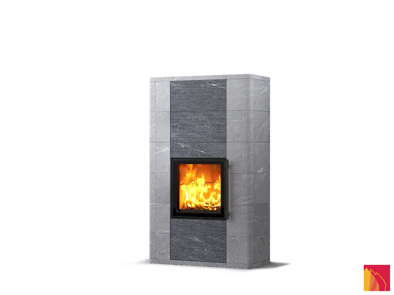 Les options de finition sont la stéatite lisse classique et la surface Grafia, sur laquelle des motifs chatoyants irréguliers ont été réalisés au jet d’eau. La porte moderne de forme carrée offre une vue superbe sur le feu.