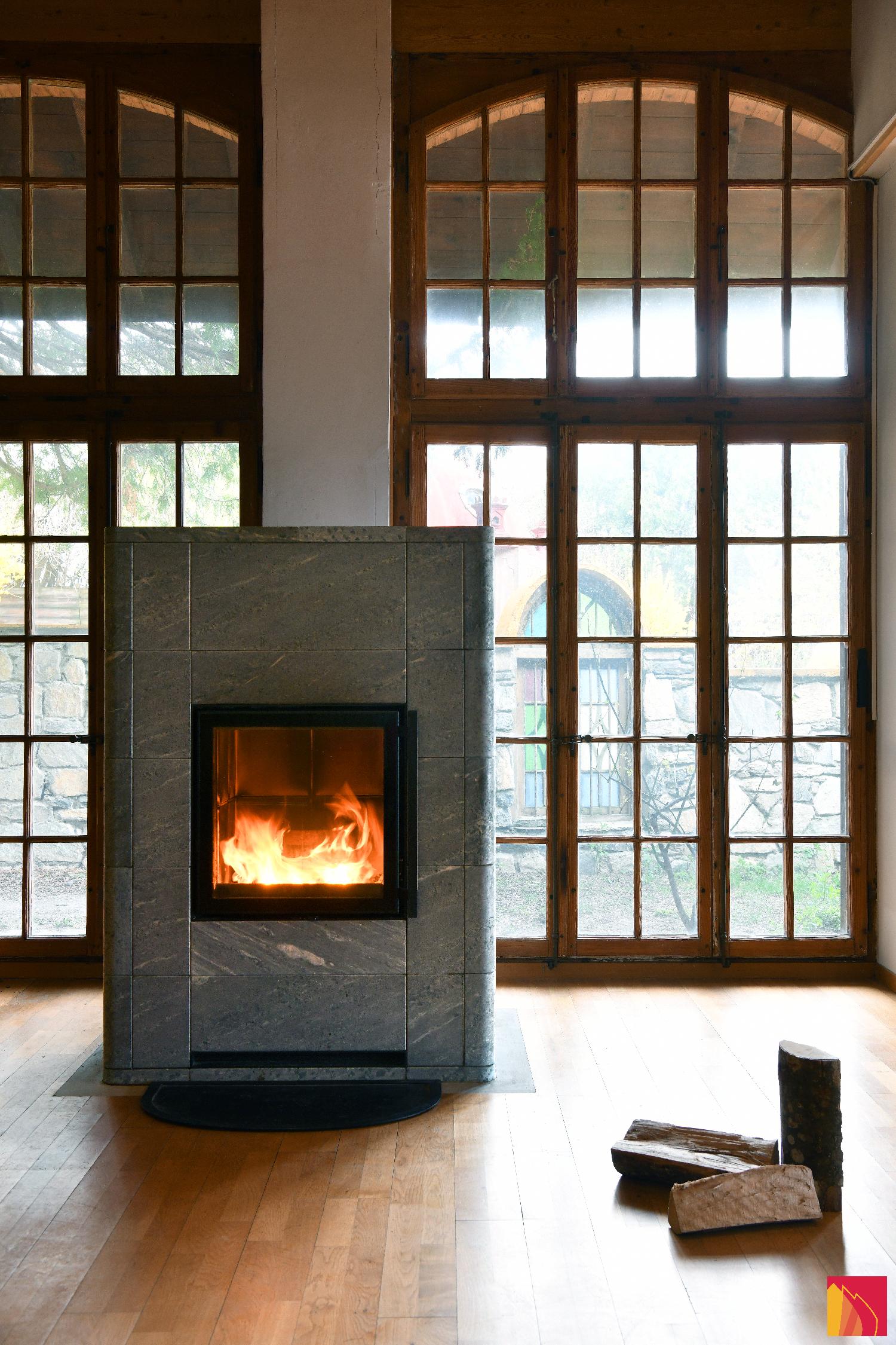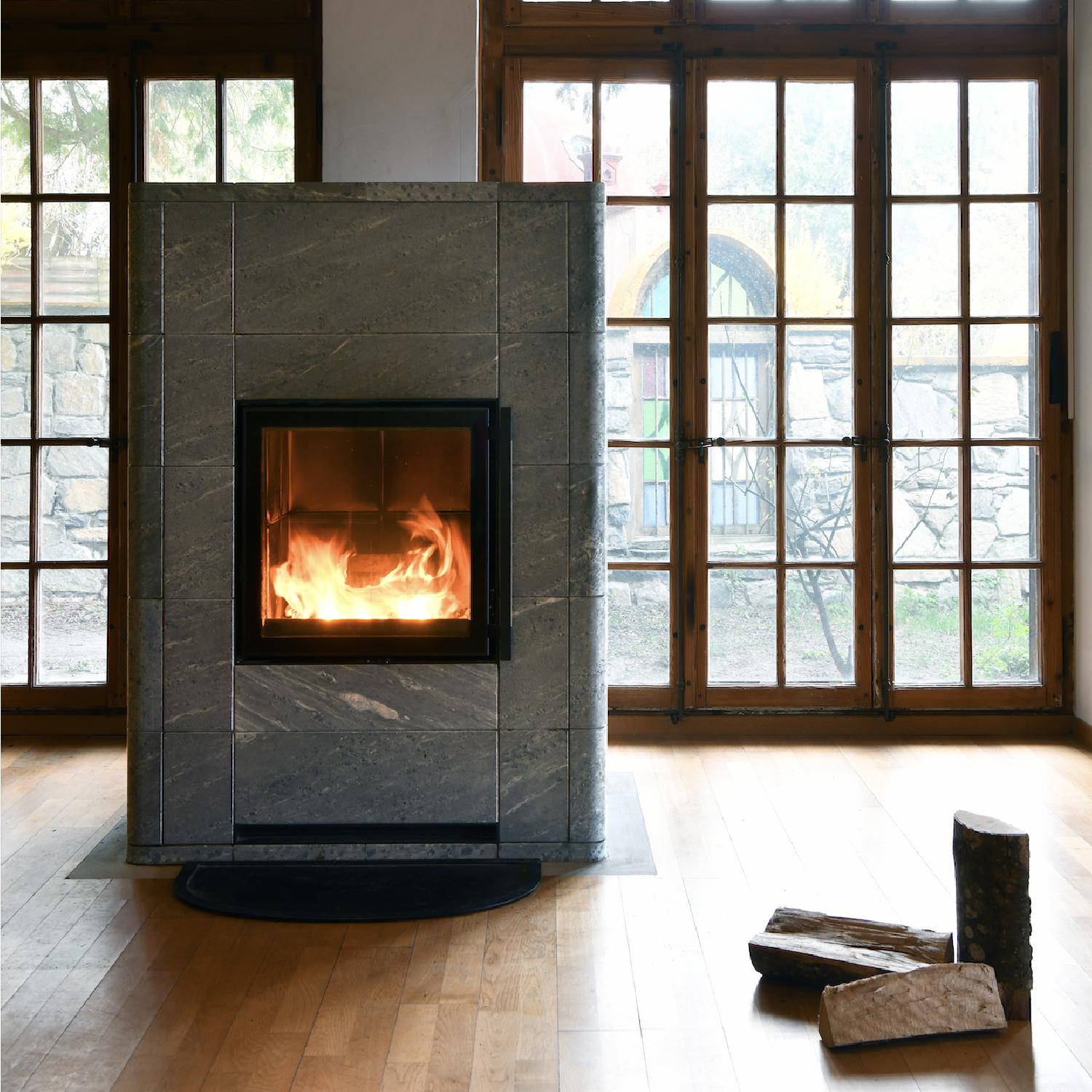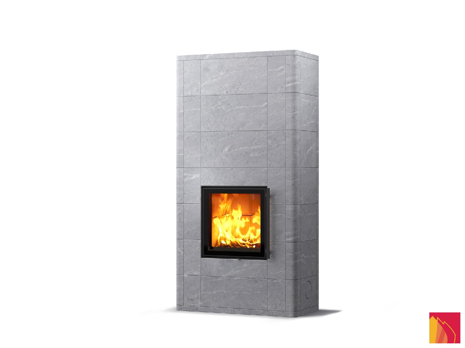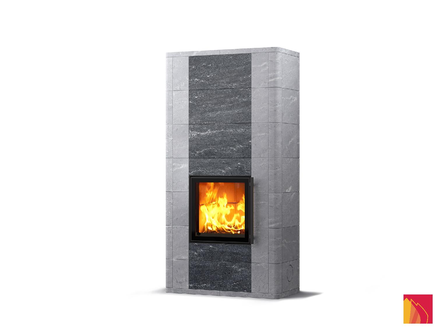 Les options de finition sont la stéatite lisse classique et la surface Grafia, sur laquelle des motifs chatoyants irréguliers ont été réalisés au jet d’eau. La porte moderne de forme carrée offre une vue superbe sur le feu.