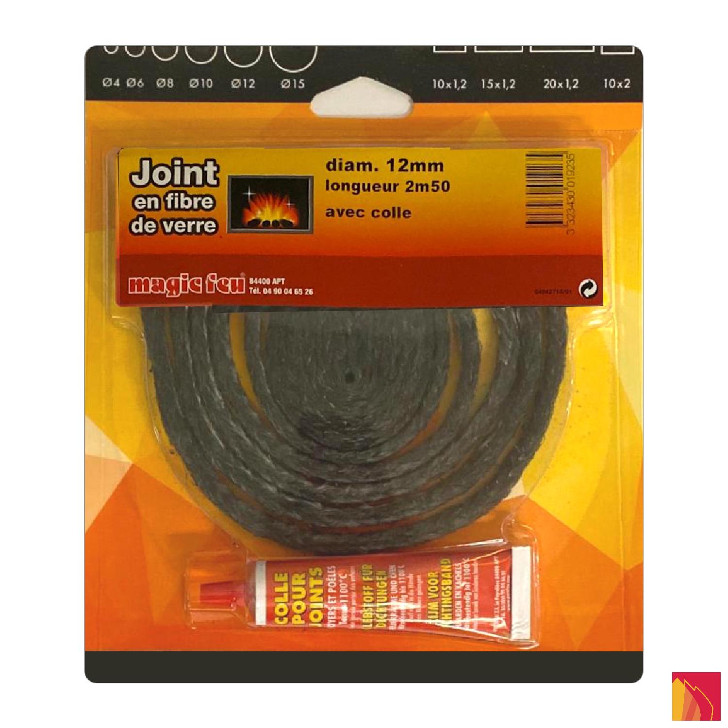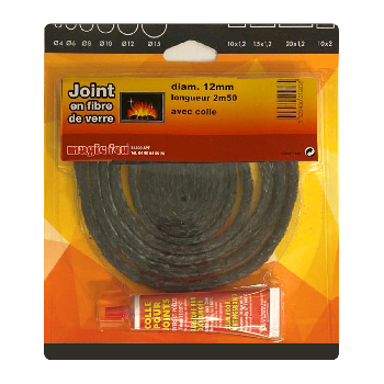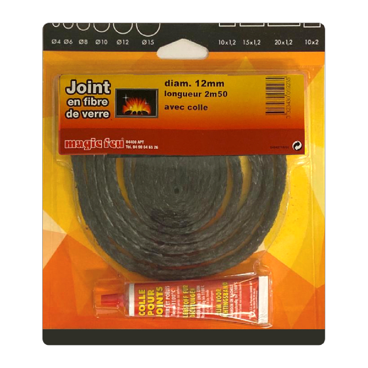 Guarnizione tonda in fibra di vetro intrecciata, diametro 12mm, lunghezza 250cm, con tubo di colla ad alta temperatura incluso.